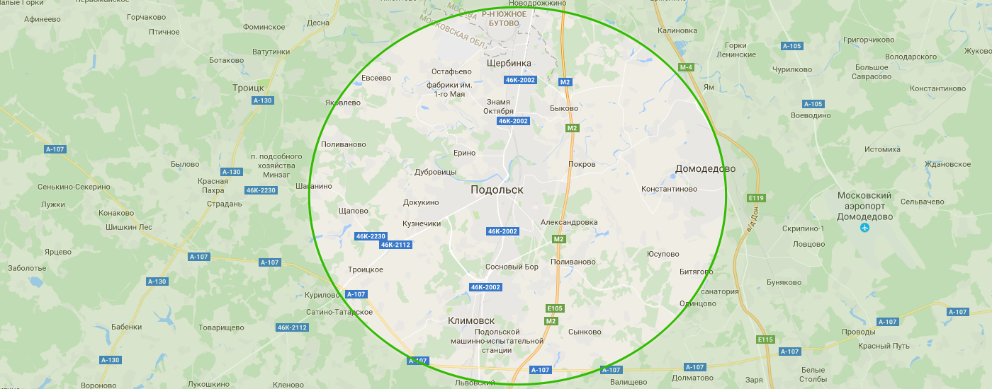 Домодедово, Битягово, Юсупово, Видное, Бутово, Щербинка, Климовск, Троицкое, Сосновый Бор и другие